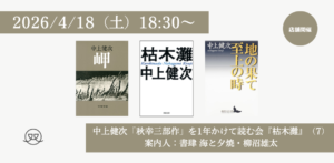 - 【店舗開催】2026/4/18(土) 18:30〜中上健次「秋幸三部作」を1年かけて読む読書会(7)『枯木灘』(案内人:書肆 海と夕焼・柳沼雄太)