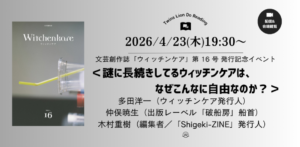 - 【会場&オンライン】2026/4/23(木)19:30〜⽂芸創作誌「ウィッチンケア」第 16 号 発⾏記念イベント<謎に⻑続きしてるウィッチンケアはなぜこんなに⾃由なのか?>多⽥洋⼀&仲俣暁⽣&⽊村重樹