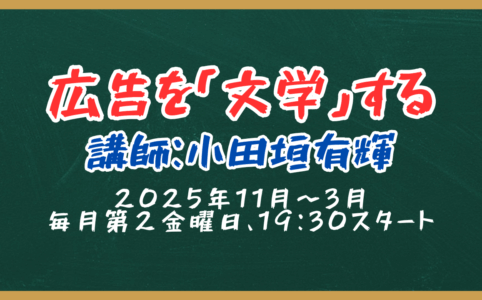 このたび双子のライオン堂では、小田垣有輝さんを講師にお招きして講座「広告を〈文学〉する」を開催します。 「お笑いを〈文学〉する」が大好評だった小田垣有輝さんによる新しい講座を始めます。 普段の生活で目にする広告・・・テレ...