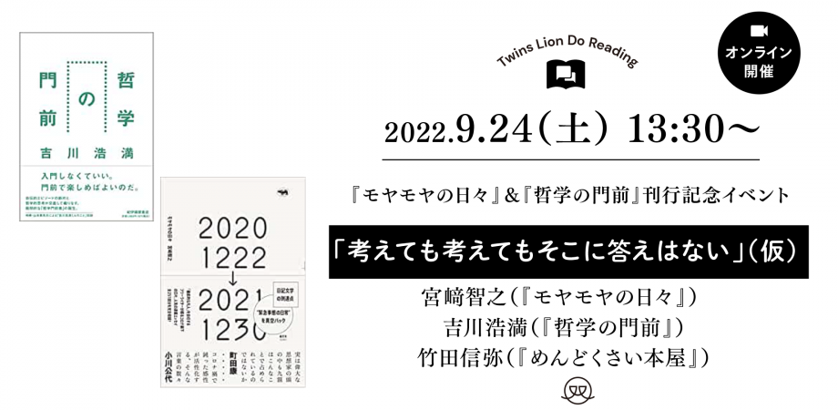 そして、両名に加え、常にめんどくさい思考の中でがんじがらめにされている双子のライオン堂店主の竹田を司会に、「考えても考えてもそこに答えはない」(仮)をテーマにトークをします。