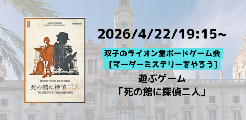 【店舗開催】2026/4/22(水)19:15~双子のライオン堂ボードゲーム会 [マーダーミステリーをやろう:「死の館に探偵二人」]