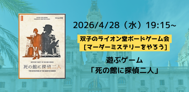 【店舗開催】2026/4/28(火)19:15~双子のライオン堂ボードゲーム会 [マーダーミステリーをやろう:「死の館に探偵二人」]